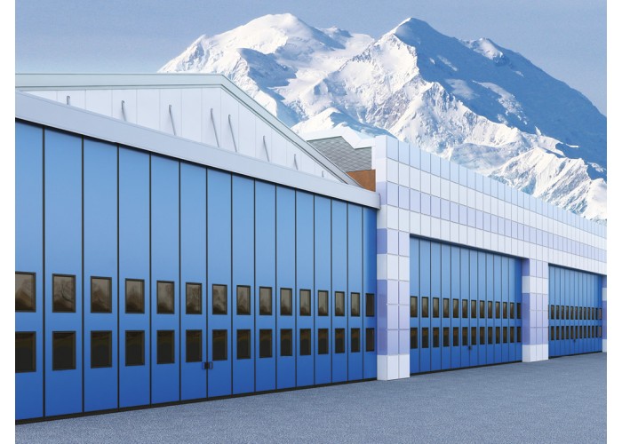 Складные ворота с нижней направляющей — идеальное решение для перекрытия проемов ангаров для хранения и обслуживания крупногабаритной техники, ангаров большой и малой авиации