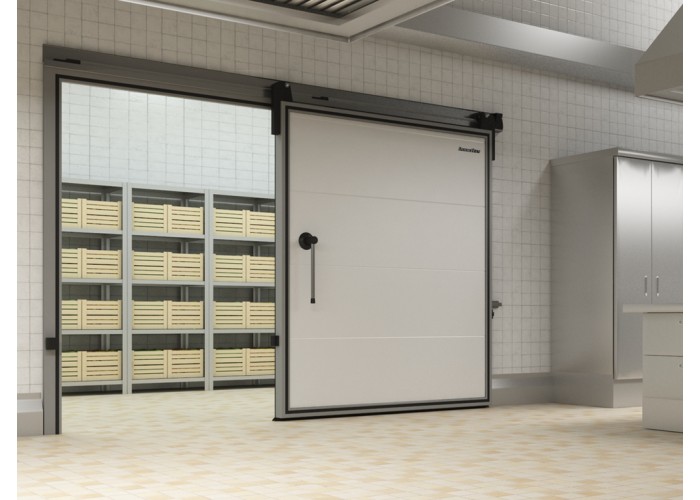 Среднетемпературные и низкотемпературные откатные двери IsoDoor IDS1 предназначены для организации входных групп холодильных и морозильных камер складов, терминалов, логистических центров, предприятий пищевой промышленности и торговли с большим трафиком механизированных погрузочных средств.